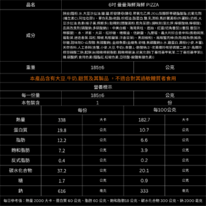 食材內容: 番茄紅醬、手撥鮮蝦、干貝、透抽、風味蟹肉棒、起司、手工薄脆餅皮 Tomato red sauce, hand-picked shrimp, scallops, soy sauce, flavored crab sticks, handmade crispbread crust 商品評價 目前沒有評價。 只有註冊並且購買過商品的顧客才能撰寫評價。